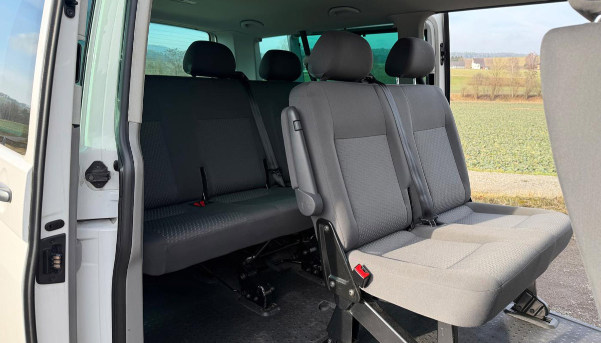 Das Fahrzeug bietet sieben bequeme Sitzplätze, alle mit Gurten, zwei grosse Schiebetüren für bequemes Ein und Aussteigen sowie einen grosszügigen Kofferraum für Gepäck, Skier oder Kinderwagen. Der Innenraum ist sauber und gepflegt, man fühlt sich sofort wohl.